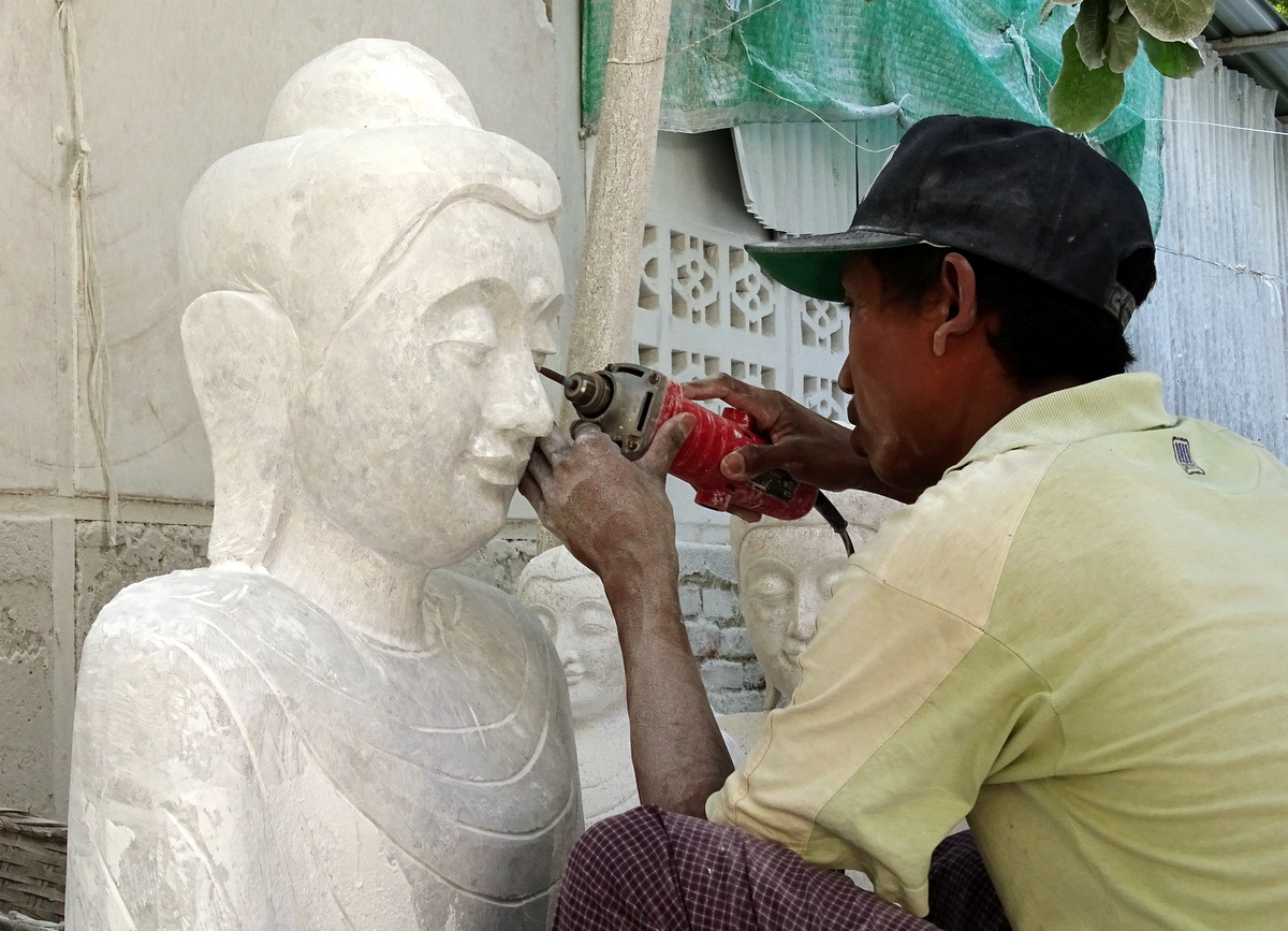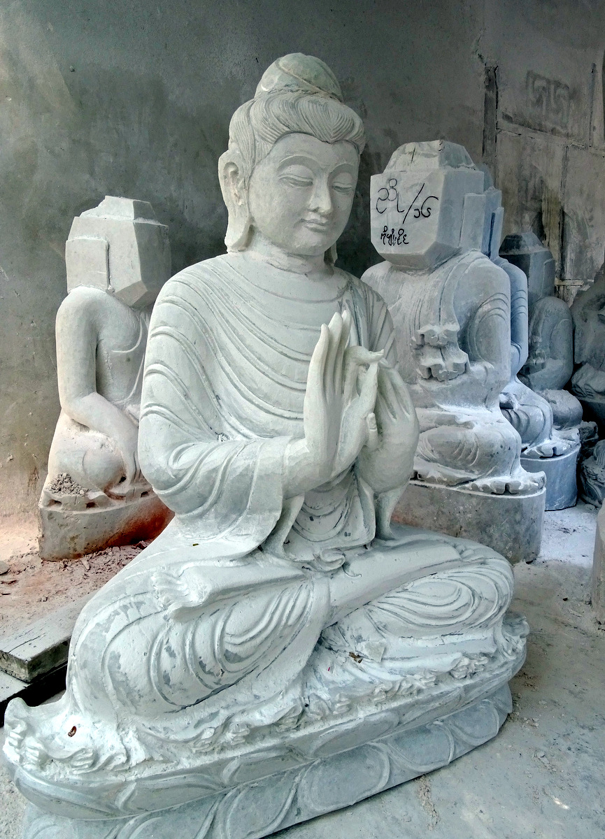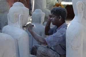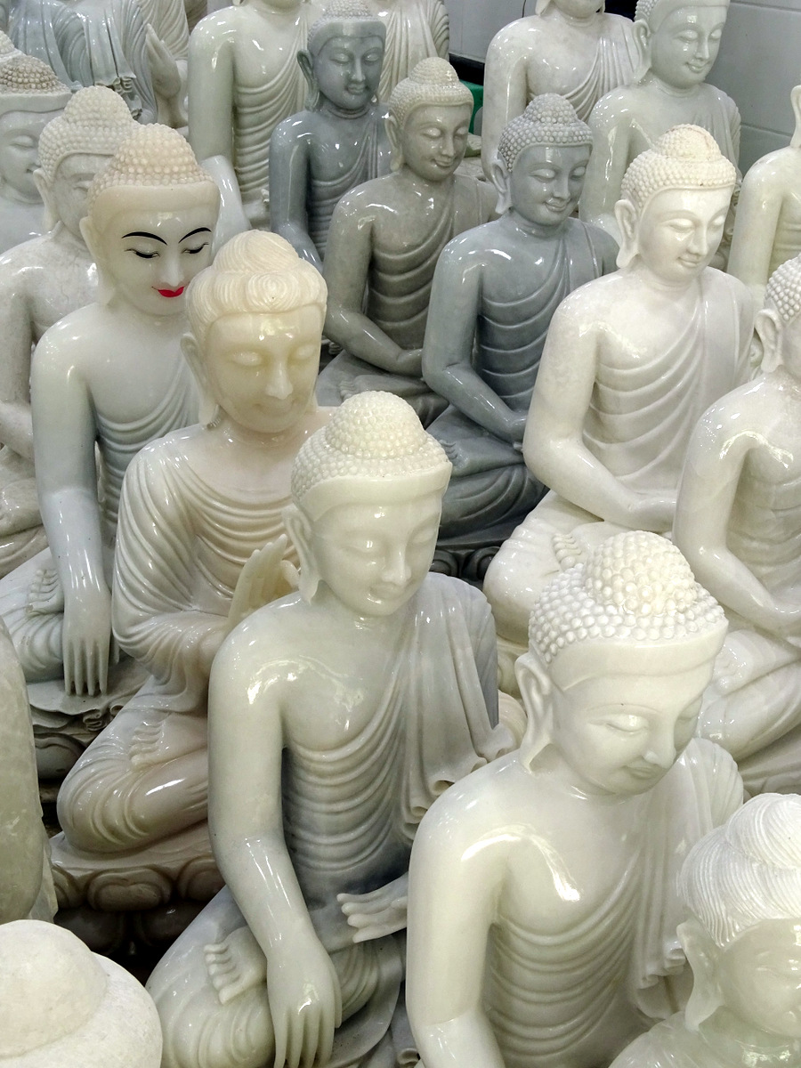 Je bouwt een voorraad je op, bewerkt alles behalve de gezichten… en als de klant dan het beeld koopt kan hij nog bepalen welke uitdrukking zijn boeddhabeeld moet krijgen…
