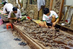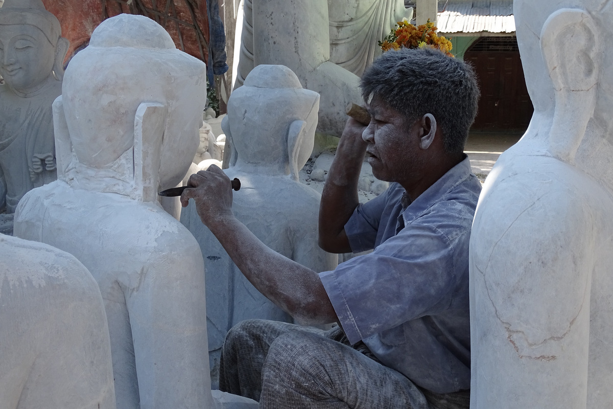 Amarapura, ten zuiden van Mandalay, was maar voor twee korte periodes tijdens de 18de en 19de eeuw een koningsstad en staat vooral bekend om de U Bein brug, gebouwd rond 1850 en waarschijnlijk de oudste en toen langste (1200 meter) teakhouten brug van de wereld over het Thaungtaman meer. De lokale bevolking maakt veel gebruik van de brug, maar rond zonsondergang wordt de brug overgenomen door de honderden Burmese en buitenlandse toeristen om een foto te maken van de brug bij zonsondergang. Voetje voor voetje schuifelen we over de brug, telkens weer wachtend op alle selfie makende dames en heren die schijnbaar aan één foto niet genoeg hebben, maar er 30 in alle standjes moeten maken. Het doet me denken aan de aan selfie verslaafde Chinezen. Ik hoop niet dat ze hier in Myanmar die kant ook opgaan, want dan verliest dit land een groot deel van zijn charme…