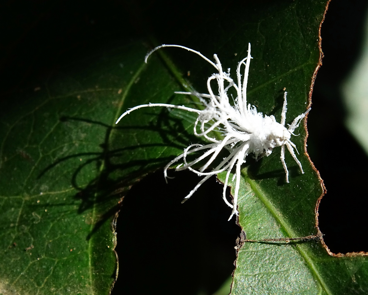 Hij liet ons de whoolly aphids zien. Dat waarvan wij dachten dat het een klein soort paddestoelen of schimmels waren, bleek een enorme kolonie kleine witte insecten, de mooiste soort van de whoolly aphids, met wonderlijke lichaamsbouw. Kleine kunstwerkjes die bij de minste aanraking wegspringen.
