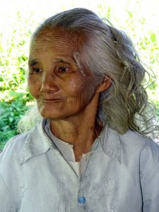 Vanaf het Akha dorp ziin we naar een hoog op een berg gelegen Ann dorp gelopen. Omdat ze er een eigen geesteswereld op nahouden, het zijn animisten, sluiten ze niet onmiddellijk aan bij andere bergvolkeren. Hun serene, zwarte kledij wordt fijnzinnig opgesmukt met eenvoudige juwelen. De metaalkleurige armbanden zijn gemaakt van oude, niet bruikbare potten en pannen. Ieder dorp heeft twee sjamanen/medicijnvrouwen. Wij gingen even bij haar op bezoek.